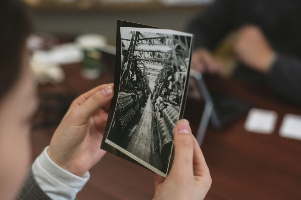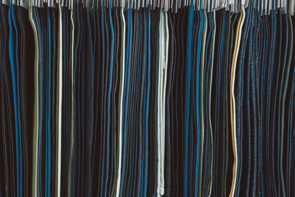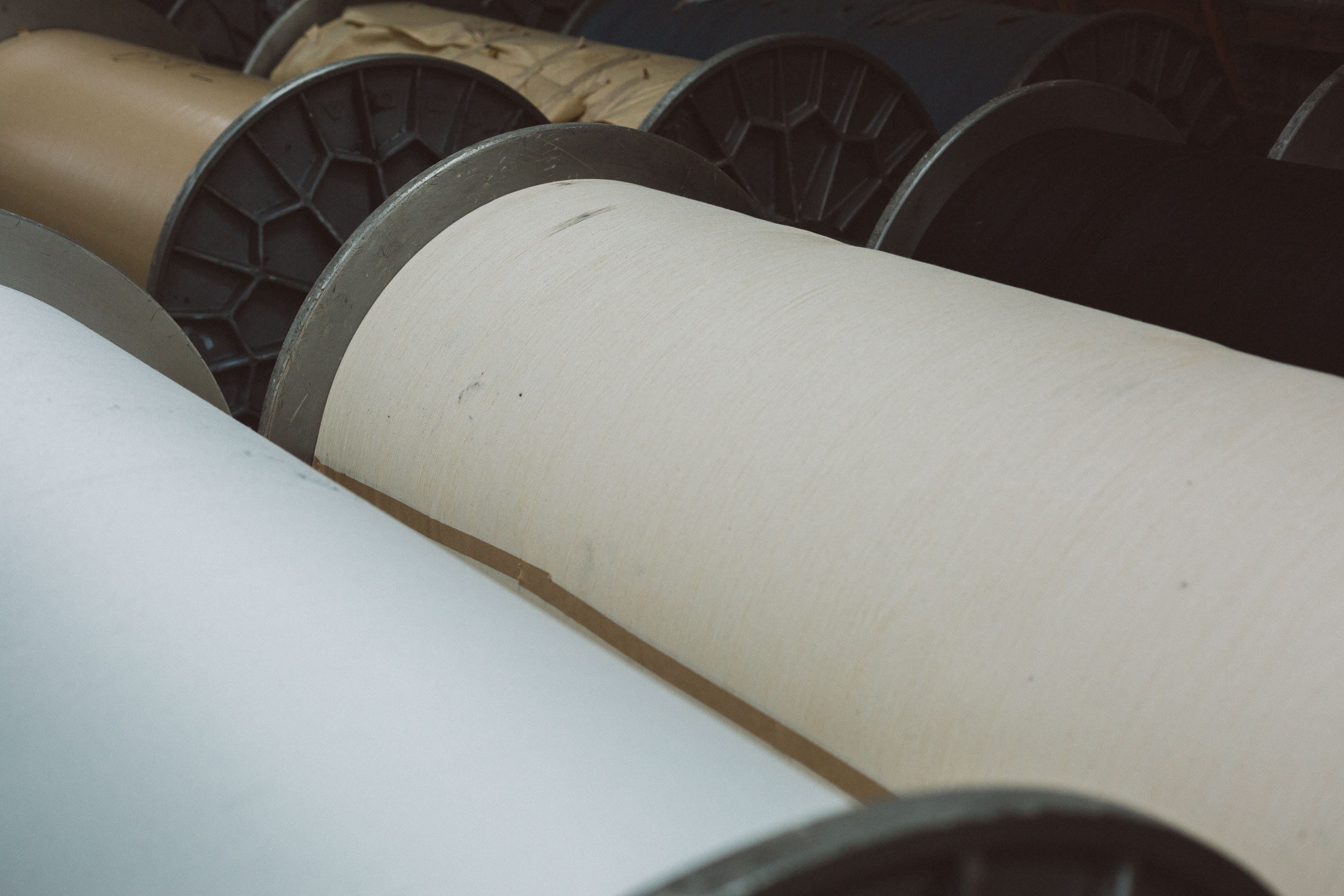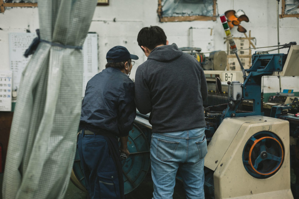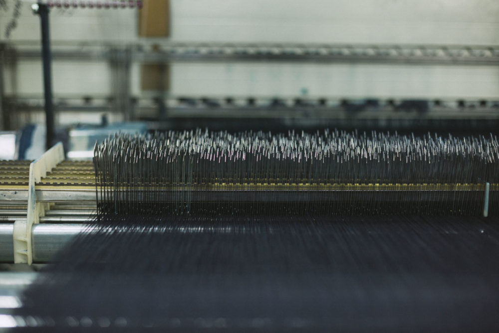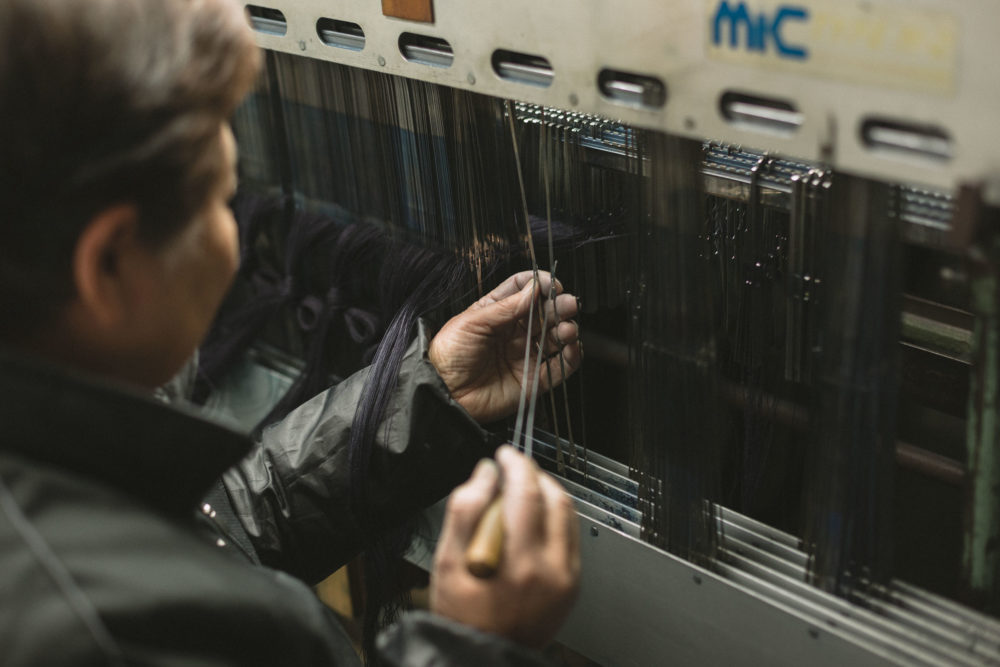 篠原テキスタイルに到着し、静けさに驚いた。しかし一歩工場に足を踏み入れると、そこは話をするのに距離が近くなくては通じない程、機械の音で溢れていた。綜絖そうこうという作業では、織物の規格通りに、約2,000~8,000本もの糸をタテ糸の配列、入り本数を1本の間違えもなく手作業で通す。エアージェット機・レピア織機・シャトル、3種類の織機を企画によって選び、織っている。工場は日・祝を除き、8時間を3人交代で24時間稼働し続け、1日おおよそ6kmのデニム生地が出来上がる。工場は日・祝を除き、24時間体制で稼働し続け、1日おおよそ6,000mのデニム生地が出来上がる。